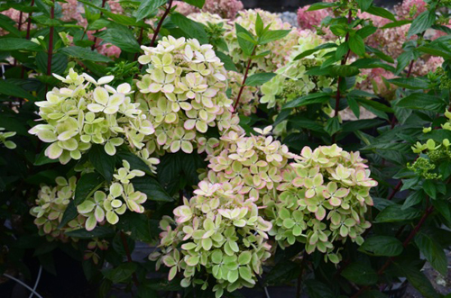Съцветията на изящно растение са с конусовидна форма, големи, със заоблен, почти сферичен връх, с дължина до 20 см. Те се състоят от големи стерилни цветя на дълги дръжки, всеки от които е оформен от четири заоблени листенца. На храста съцветията се появяват през юни и по време на вегетацията променят бялата си сянка 5-7 пъти. От снежнобялите цветя те първо се превръщат в сметана, след това придобиват зеленикав шам фъстък, след което стават нежна сьомга. В бъдеще цветовата схема на венчелистчетата включва коралови и розови нюанси и накрая, с пристигането на есента, съцветията са буйни цветни шапки от виненочервени тонове. Интересно е, че често на едно съцветие можете да видите няколко от горните нюанси. Но можете да повярвате: пастелно зелено е чудо колко красиво е във всеки от своите флорални тоалети! Цъфтежът на метличената хортензия продължава до края на септември.