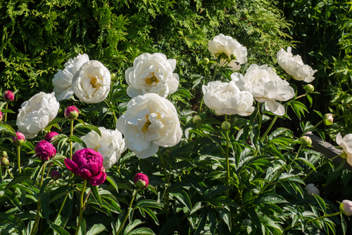 Като спътници на нашата героиня е по-добре да изберете растения според сянката на съцветията. Разкошните снежнобяли пъпки на Мис Америка ще изглеждат несравнимо в комбинация с цветя, отлежали в алено и тъмно червено, винени тонове. Прекрасен пример за такива съседи на растения: карамфил или хейхера. Освен това градинският чай, звънецът, ирисите и орлови нокти ще подчертаят свежестта и белотата на американските многогодишни съцветия. Можете да комбинирате божури от този сорт с иглолистни и вечнозелени растения, с декоративни широколистни растения и ароматни билки.