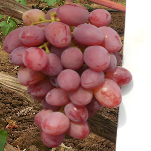 Deze druivensoort onderscheidt zich door de grote omvang van de trossen en hun visuele aantrekkingskracht bij voldoende bestuiving. De gemiddelde massa van een goed uitgevoerde borstel varieert van 550-700 gram, de vorm is meestal conisch, de dichtheid is matig. Dankzij de vrije opstelling van de druiven beschadigen ze elkaar niet, kreuken of vervormen ze niet. Ruta's kammen zijn van gemiddelde lengte, lichtgroen en kruidachtig. De bessen hebben de vorm van een tepel en zijn geverfd in een zeer delicate, oogstrelende roze kleur en zijn bedekt met een lichte laag van een lichte wasachtige coating. Ze kunnen een lengte van 36 mm en een diameter van 22 mm bereiken, wat ze kenmerkt als groot en zeer groot. Gewicht, afhankelijk van de maat, varieert tussen de 7-12 gram.Het vruchtvlees van deze variëteit is dicht, vlezig, heeft een uitstekende uitgebalanceerde smaak met een neutraal aroma en afdronk. Het sap dat uit druiven wordt geperst is lichtroze door het gekleurde vruchtvlees, het suikergehalte kan oplopen tot 20 g / 100 ml. Gegevens over zuurgraad worden niet gepresenteerd, maar te oordelen naar de harmonie van de smaak van bessen, overschrijden de indicatoren de norm niet. De schil is vrij dun, en daarom bijna ongrijpbaar wanneer gegeten. Hoewel de zaden aanwezig zijn, verslechteren ze ook de gastronomische eigenschappen van de druiven niet al te veel.