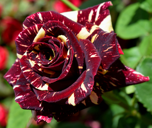 Имам Abracadabra floribunda като на снимката. По-точно, всяко негово цвете е чиста изненада, как ще се отвори от пъпката - вечна загадка. Тя може да бъде много петна от едната страна, докато втората е почти равномерен бургундски тон с случайни ивици. Интересно е да се види как жълтеникавото кремообразно петно побелява, докато избледнява. Сортът е изрязан в букет, стъблата са почти без бодли, дръжките са с прилична дължина. Но има и достатъчно минуси. Този сорт няма почти никаква миризма. При кишаво време, без слънцето, той седи на пъпки и не се отваря. Черното петно с брашнеста мана тихо заобикаля другите рози, но тази непременно ще бъде атакувана и понякога постоянната превенция не помага. През зимата замръзва дори в нашия Юг.
