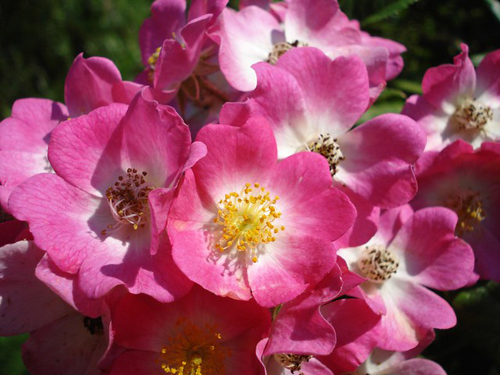 През топлия сезон на растението се появяват множество малки, заострени пъпки с тъмно розов оттенък. Те се събират в големи четки от 25-55 парчета и, когато се отворят, са с малки размери: само 3-4 см в диаметър. Цветът на нежните недвойни цветя на мускусния хибрид в началото на фазата на разтваряне е ярко розов с примес на черешови багрила и по-късно става по-светъл. Сърцевината на всяко цвете е снежнобяла, а тичинките са златисти. Между другото, именно те излъчват удивителен, свеж аромат с леки лимонови нотки. Пъпките се състоят от 4-8 листенца. Растението винаги цъфти обилно и продължително, до стабилни слани. Моцарт е многоцъфтящ сорт. Освен това през есента многогодишното растение е просто осеяно с цветни капачки, които остават дълго време на храста.
