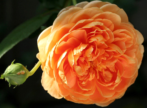 Пъпките са дълги, яйцевидно заострени. Цветната розетка е голяма, увиснала, 10 - 12 см в диаметър, пълна, полудвойна, състояща се от повече от 40 венчелистчета. Формата е в дълбока чаша, напомняща на стари рози. В началото на разтварянето външните венчелистчета грациозно се сгъват назад, докато вътрешните остават плътно притиснати. Постепенно се отваря, цветето излага средата, украсена с червени тичинки. Цветовата гама на сорта съчетава медни, коралови и кехлибарени тонове. Цветът на красивата роза не може да бъде описан, тя блести, променя се в зависимост от етапа на разкриване. Разкошната форма на розетката в началото на разтварянето създава прекрасен цветен ефект, позволяващ ви да се възхищавате на цветовия контраст от двете страни на венчелистчето. Външната страна има бледо медножълт цвят, докато вътрешната страна на венчелистчетата блести с ярка мед.