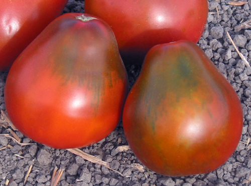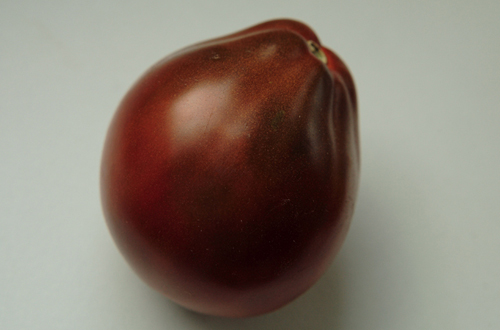 Плодовете са плътни, с форма на круша, леко оребрени или гладки. Кожата е плътна, лъскава. Зрелият домат придобива кафяво-бордо цвят. Пулпът е месест, умерено воднист, със сладък вкус. Плодовете са с малки размери, средното тегло е 50 - 80 грама. Вкусът е отличен.