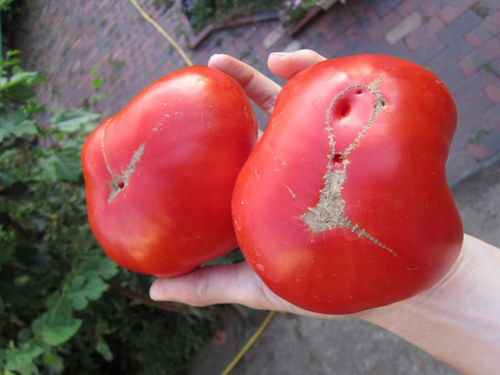 - при умерена влажност на почвата кората на плодовете на лапата на Мечката не се напуква, но ако този фактор се пренебрегне през периода на зрялост и градинското легло е силно навлажнено, тогава доматите с големи плодове могат да се спукат близо до дръжката;