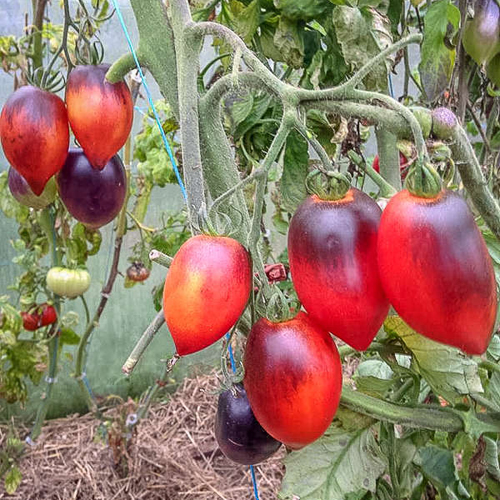 Плодовете от този сорт са красиви както по форма, така и по цвят. Формата е удължено-сливовидна или цилиндрична, отгоре е увенчана с изряден чучур. Незрелите плодове са зелени на цвят, с голямо тъмно лилаво петно, което започва близо до дръжката, а на някои домати пада почти до върха. Докато узрява, което започва от върха, доматът става червен, напълно узрелият плод е тъмночервен с антоцианинови плешки. Кожицата не е дебела, лъскава, поради което плодовете изглеждат лакирани. Целулозата е тъмно малина, месеста, консистенция на мармалад, сочна. Камерите за семена са малки, семената са малко. Много производители на домати отбелязват отличния вкус на нашия герой, сладостта преобладава във вкуса. Доматите са с малки размери, със средно тегло 100 грама. Най-малките тежат около 60 грама, а най-големите тежат 130 грама. При нормализиране на четката масата на домата се увеличава до 200 грама.