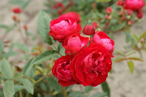 Hoa nhỏ, đường kính 4 - 5 cm, cỡ vừa, có 17 - 25 cánh hoa. Hình dáng của hoa là hình cầu, nhìn từ xa giống như một bông hoa mẫu đơn thu nhỏ đang tan biến không hoàn toàn. Trong quá trình mở hoa thị, các cánh hoa cong mạnh vào trong giữ được hình dạng tròn của hoa gần như cho đến thời điểm nở hoa. Màu được xác nhận là đỏ sẫm hoặc đỏ. Nhưng nhiều người trồng thấy nó có màu đỏ thẫm, và một số người mô tả màu đó là màu đỏ tươi.