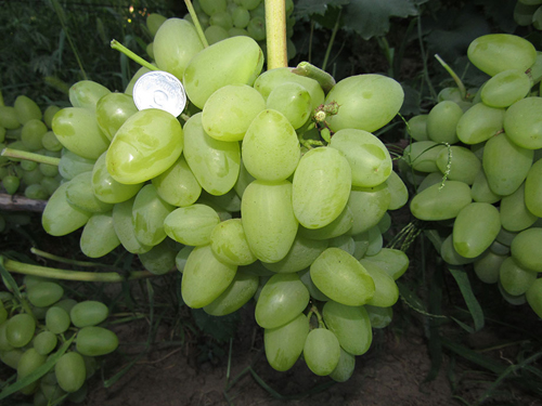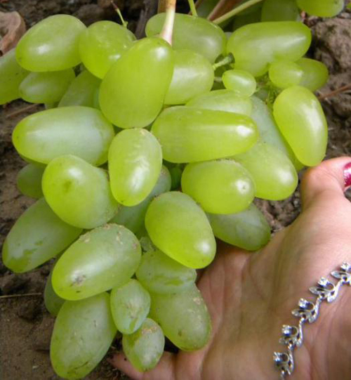 Гроздовете са много големи, цилиндрично-конични или конични, понякога разклонени, умерено плътни, със средно тегло 600-800 грама, максимум - до един и половина килограма. За да се получат масивни четки, изобщо не е необходимо да се чака растежът на многогодишна дървесина в продължение на много години, хибридът още в първия си плод показва "сигнализация" с впечатляващи размери.Гребените са със средна дължина, зелени и здрави. Плодовете са масивни, яйцевидни или с форма на зърна, зеленикави и при добра светлина са жълти, дълги 37-42 мм и 23-27 мм в диаметър в най-широката част. Най-голямото грозде достига 5 см дължина и тегло до 20 грама. Пулпът е нежен, сочен и месест, вкусът е съвсем прост, но хармоничен. Ароматът и послевкусът не са най-изразителните. Само при дълъг престой на храстите гроздето започва да придобива леки плодови тонове, но пулпата може да се втечни и кожата да се сгъсти прекалено.