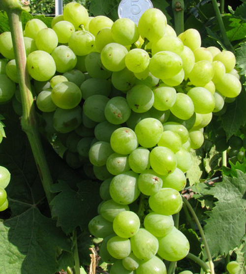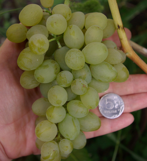 Размерът на гроздовете може да варира значително в зависимост от натоварването на храстите и условията на отглеждане. Масата им варира от 300 до 600 грама, най-забележителните могат да достигнат килограм. Гребените са къси и със средна дължина, тревисти. Формата на гроздовите гроздове е цилиндро-конична, структурата е умерено рохкава. Поради безплатното подреждане на плодовете, те не се изстискват и не се деформират, а благодарение на еднаквия си размер гроздовете изглеждат спретнати и привлекателни. Гроздето е доста голямо, с овална или зърнеста форма, расте до 30 мм дължина и 19-21 мм в диаметър. Цветът им, дори когато е узрял, е зеленикаво-бял, допълнен от лек восъчен разцвет на повърхността. Плодовете на Elegance с FZHTC изглеждат малко по-добре.Въпреки че плодовете му не могат да се похвалят с изключителна равномерност, те придобиват кехлибарен загар на слънце. Средното тегло на гроздето е 5-7 грама. Пулпът е умерено плътен, сочно-месест, много сладък с деликатен аромат на индийско орехче в послевкуса. Като пряк потомък на Rapture, сортът е наследил отлично натрупване на захар. Този индикатор в сока от горски плодове е 19-22 g / куб. См, с титруемо ниво на киселинност от 6-8 г / куб. Дм. Кората на плодовете е доста тънка, но здрава и е много лесна за дъвчене. Малки семена, 1-2 в зрънцето, изобщо не развалят оценката по време на дегустация.