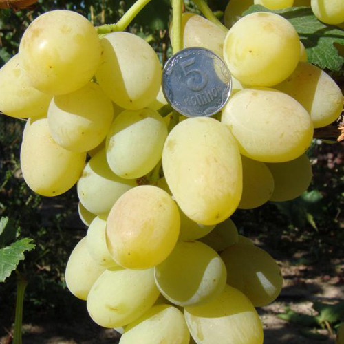 Гроздовете от сорта са доста големи, конични или цилиндроконични, умерено хлабави, със средно тегло от 500-700 грама, потенциал - до един и половина килограма. Гребените са дълги, дебели и здрави, добре развити, зелени на цвят, често с тъмно оцветени участъци.Плодовете са овално-цилиндрични, някои имат заострен връх, скучножълт, зеленикаво-бял с липса на светлина, впечатляващ размер - до 36 мм дължина и до 23 диаметър. Средното тегло на едно грозде е 9-14 грама, най-голямото - до 16 грама. В ръката те са достатъчно подравнени по калибър и маса, разположени са свободно, без да се повреждат или деформират един срещу друг. Повърхността на плодовете е покрита с леко покритие от защитен восъчен слой със средна плътност. Пулпът е сочно-месест, нежен, с ярък свеж, запомнящ се вкус и деликатен аромат, в който можете да намерите тонове индийско орехче, момина сълза и бял акациев нектар. Очевидно хибридът заслужава името си заради уникалния си букет от нюанси в аромата на плодове. Съотношението на киселина и захар в сока е балансирано, съдържанието на глюкоза и фруктоза е около 18-19 грама / 100 мл, киселини - 5-7 грама / литър. Кожата не е дебела, но доста здрава, дъвченето й по време на хранене не е трудно. По правило семената са две или три, лесно се отделят от пулпата и не оказват отрицателно влияние върху рейтинга на дегустацията на гроздето.