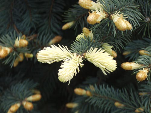 Благодарение на какви качества Пан Бялобок реши да запази копието? Факт е, че той имаше необичайни млади издънки: кремаво жълто, почти слама. Те запазват този цвят за 5-6 седмици и по това време смърчът Белобок изглежда като красавица, с която малцина могат да се състезават в „елското царство“. Пролетната комбинация от кремави, жълти, синкави нюанси на игли създава ненадминат ефект!