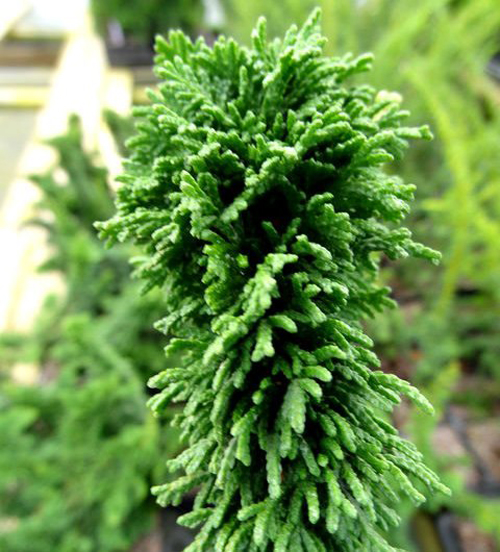 Това растение е тънко иглолистно колоновидно дърво или храст с правилна, симетрична форма. Тази функция се осъществява благодарение на късите и мощни скелетни издънки, разклоняващи се в краищата и плътно притискащи един към друг. Короната на вечнозелената култура е гъста и плътна, иглите са люспести, наситени зелени с ментов нюанс и подчертан блясък. Така остава през цялата година, което през зимата създава усещане за свежест, тържественост и тържество при гледане на растението. Вярно е, че новите издънки са малко по-различни от старите в по-светъл тон. Ако търкате иглите между пръстите си, веднага усещате приятен, леко пикантен аромат. Дървото има остър връх.