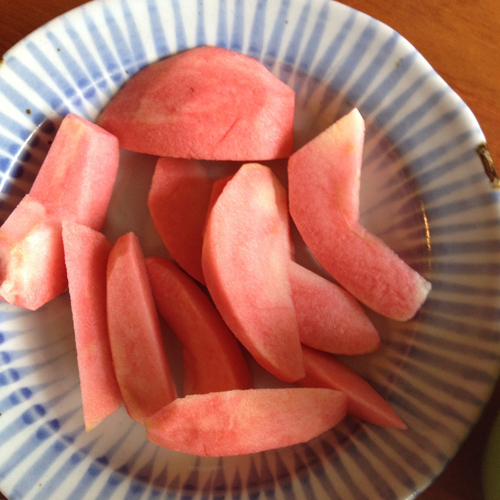 - начинът на използване е универсален. И възрастните, и децата много обичат ябълките в естествената им форма, но плодовете трябва да са напълно узрели. Поради необичайната си вкусова комбинация, розовите перли са много популярни сред кулинарните специалисти. Кипнатата пулпа се комбинира успешно с месни и дори рибни ястия, добавя се към витаминни салати, сосът от ябълки от този сорт има кадифена структура и е много приятен на вкус, чипсът се приготвя от ябълки, нарязани на пръстени. Те също така правят хлебни изделия, ябълково пюре, сайдер, конфитюр и сорбет.